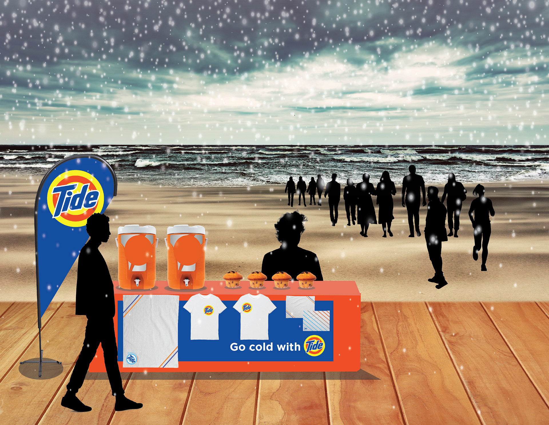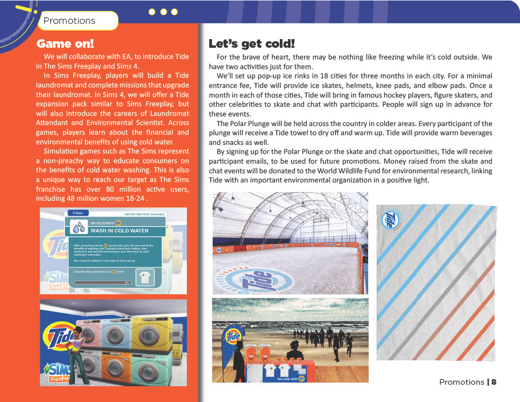 For the adventurous individuals, we created two winter activations. Pop-up ice rinks will tour 18 cities, offering rentals and monthly celebrity skate-and-chat sessions. The Polar Plunge will take place in colder regions, with participants receiving Tide towels and warm refreshments. Sign-ups collect emails for future promotions, and funds from the skate events support the World Wildlife Fund, linking Tide to environmental causes.