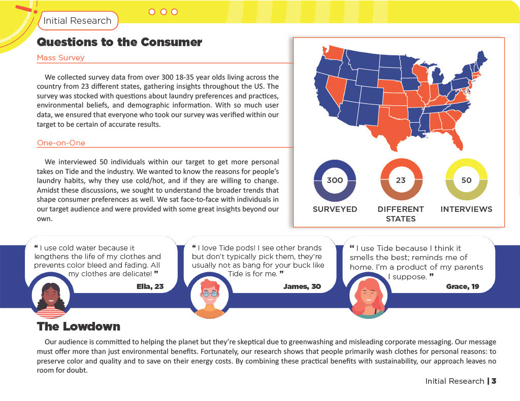 • Surveyed 300+ individuals ages 18–35 across 23 states to understand laundry habits, environmental attitudes, and detergent preferences.